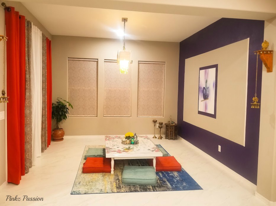 Trendsetters indeed! A Meticulously adorned temple room of Parikh's is a visual treat with devotional art and geometric patterns on the wall. The ever enchanting effigy of “Lord Krishna’ is transported via courier from India especially for the temple room.  Sharp features and sweet smile on this figurine makes one completely mesmerizing. The couple treasured those kutchhi embroidered pieces that once belonged to their parents and framed them to keep as a memory. The altar where the ‘murti’ is placed is a DIY weekend project that couple took over. Not settling for anything usual, the couple decided to make-over this corner with few clever touches on a simple IKEA TV table. With the help of white sheer drapes and red backdrop they won to create a perfect temple like ambience in the room.